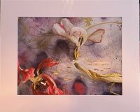 Canvasvedos valokuvasta, tulppaani-installaatio akvarelli- ja teepohjalla, kultafolio, kultakynä