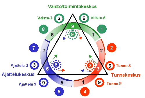 Keskustyyleissä voidaan tunnistaa kahdella tavalla painottuneita kolmosia (vaisto/ajattelukolmoset),